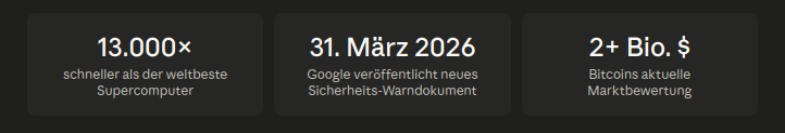 Alle anderen Adressformate geben den öffentlichen Schlüssel nur für den kurzen Moment einer Transaktion preis – und das auch nur dann, wenn tatsächlich etwas gesendet wird. Da Bitcoin alle zehn Minuten einen neuen Block schürft, hätte ein Angreifer maximal neun Minuten Zeit, um einzugreifen. Mit heutigen oder absehbaren Quantencomputern ist das schlicht nicht machbar.