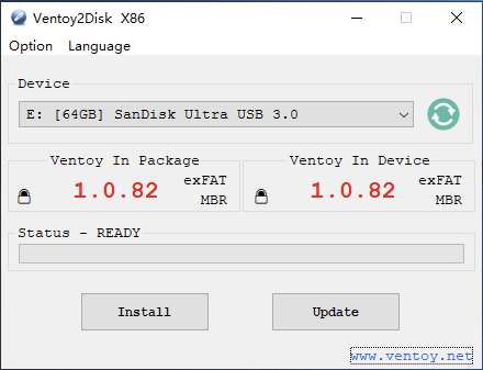 - Ventoy wird auf den USB-Stick installiert